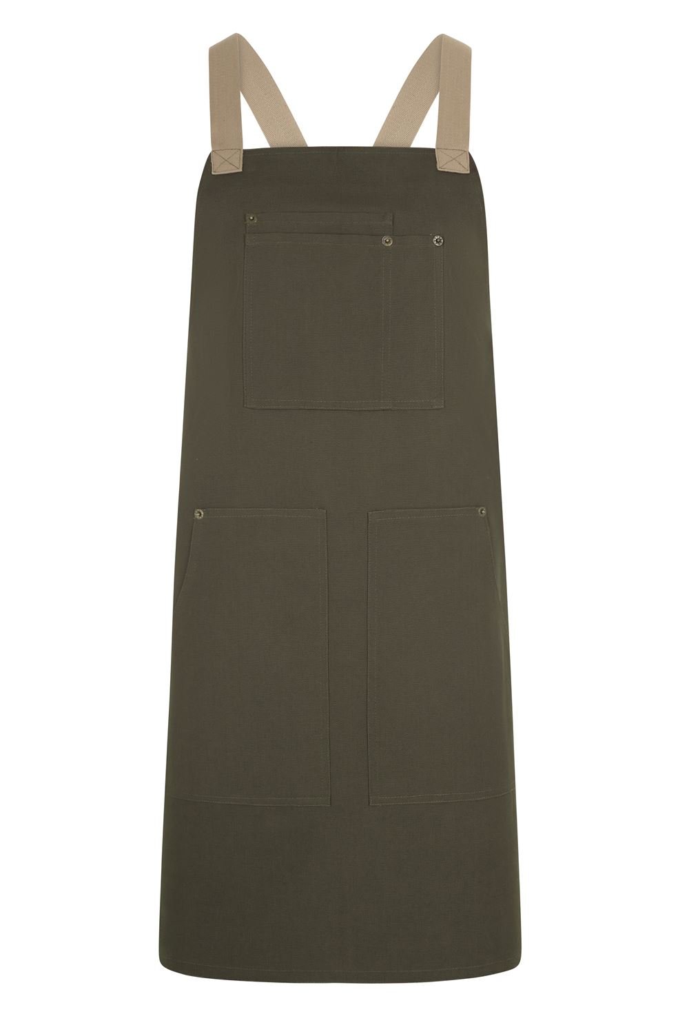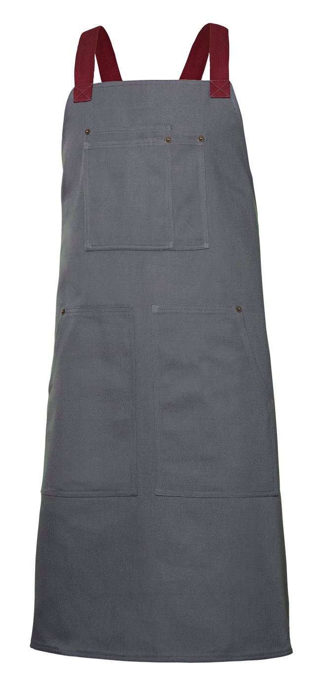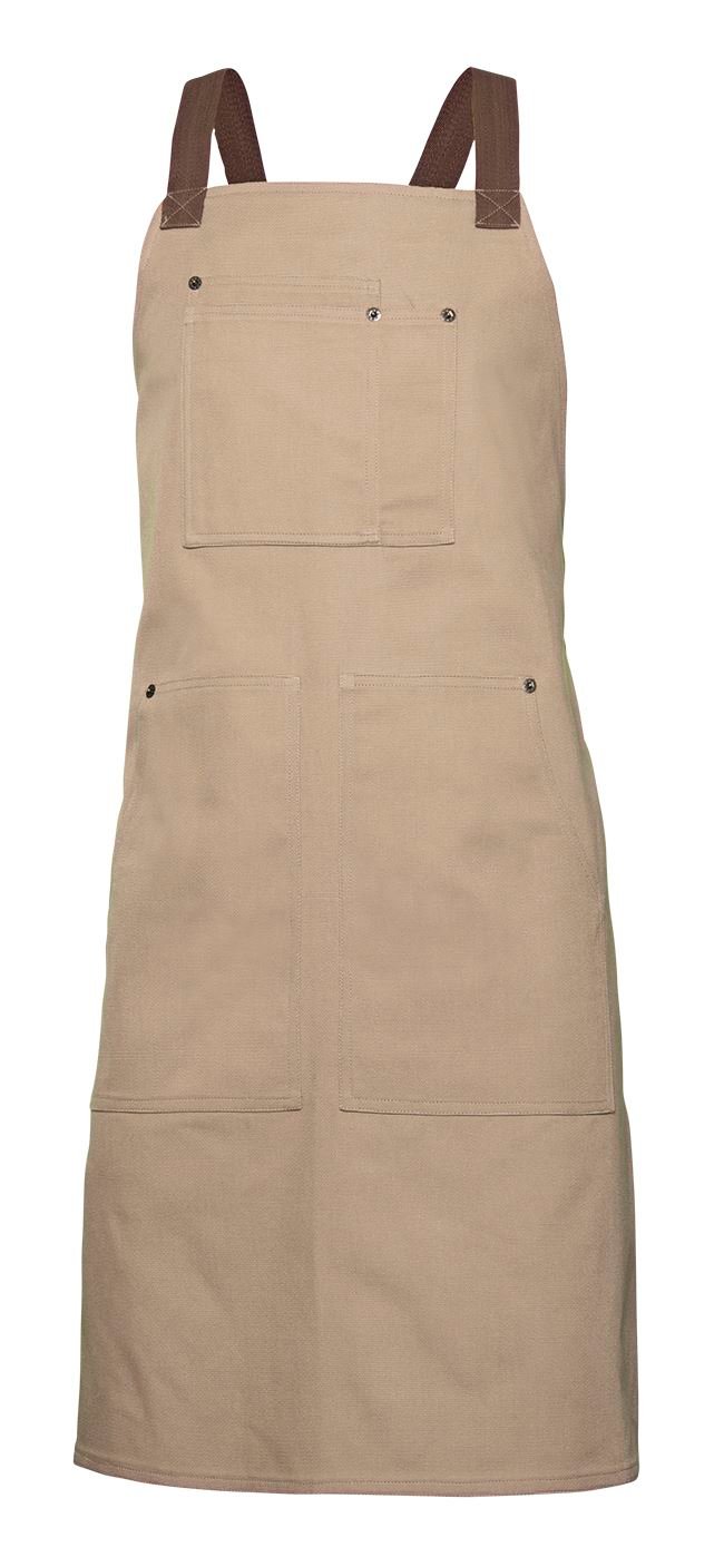 Ajustável com alças em precinta de algodão em espiga, em contraste Cruzado nas costas Rebites estilo cowboy Quatro bolsos: 1 bolso duplo no peito, com compartimento para caneta, 2 bolsos laterais