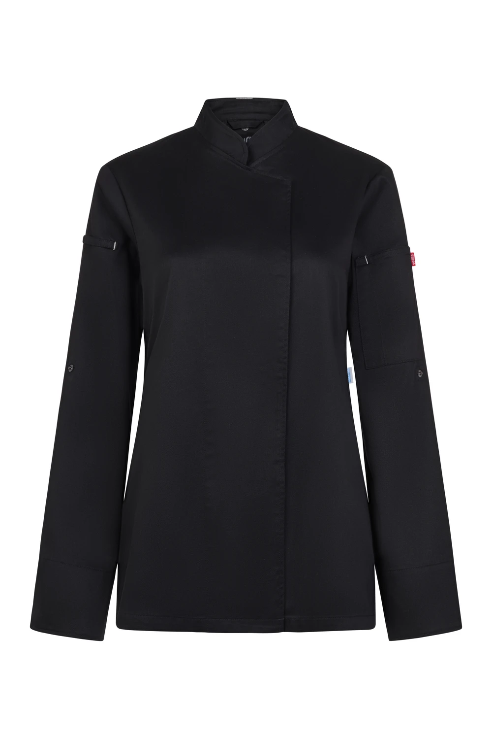 Fita na manga direita para pendurar acessórios de chef ,Bolso na manga esquerda com elástico para acessórios